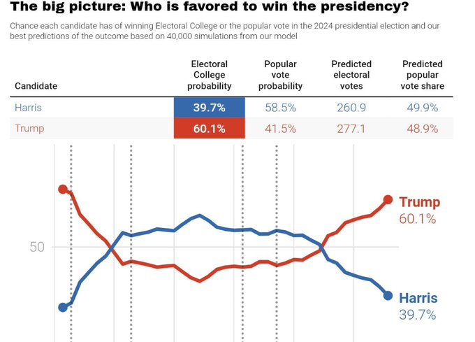 🚨 BREAKING - NATE SILVER ELECTION MODEL raises Trump's victory chances to 60.1%, PENNSYLVANIA to 61%