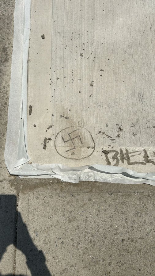 A constituent called our office about a swastika & the words "Free Palestine" carved into the sidewalk near Mount Hebron Cemetery, the final resting place for thousands of Jews. Please, tell me again that anti-zionsim isn't antisemitism. #NeveragainisNOWLarge.