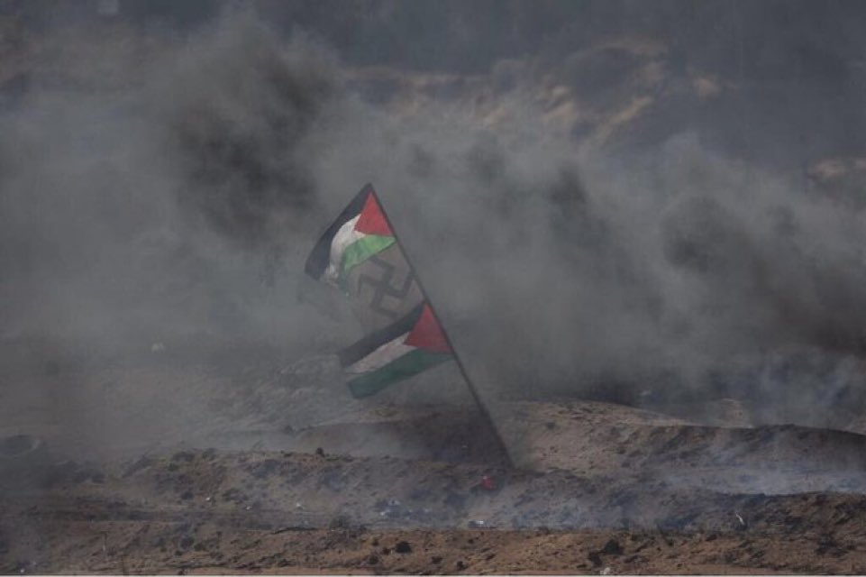 A swastika is planted along with two Palestinian flags in Gaza.
