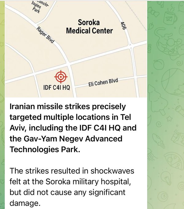 Iran claims (1:13 AM, Jun 19, 2025): “We targeted a target in the Gav-Yam Technology Park in Beersheba, near Soroka, where intelligence and cyber headquarters are located.”