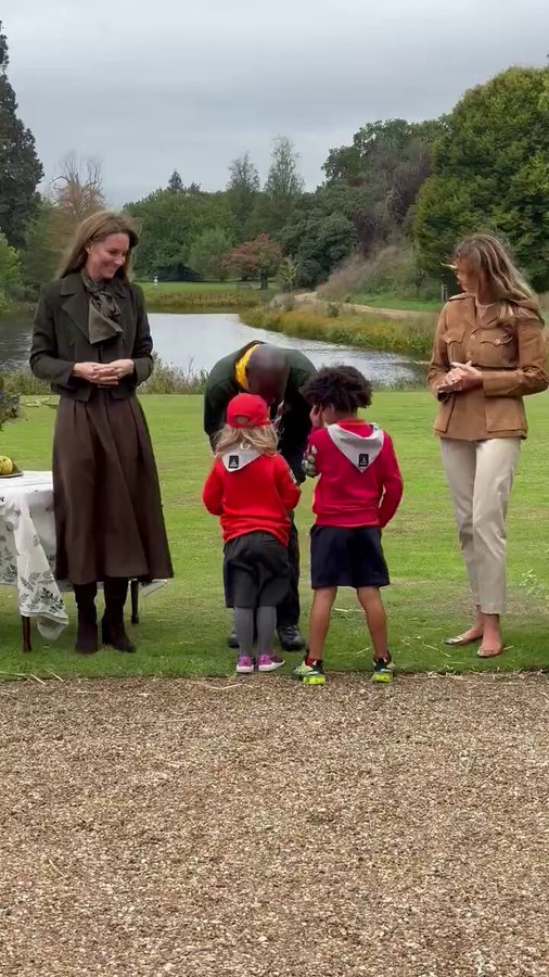 Also this morning, First Lady Melania Trump joined Princess Kate at Frogmore Cottage, where they met members of the Scouts' Squirrels program before engaging in activities with them.