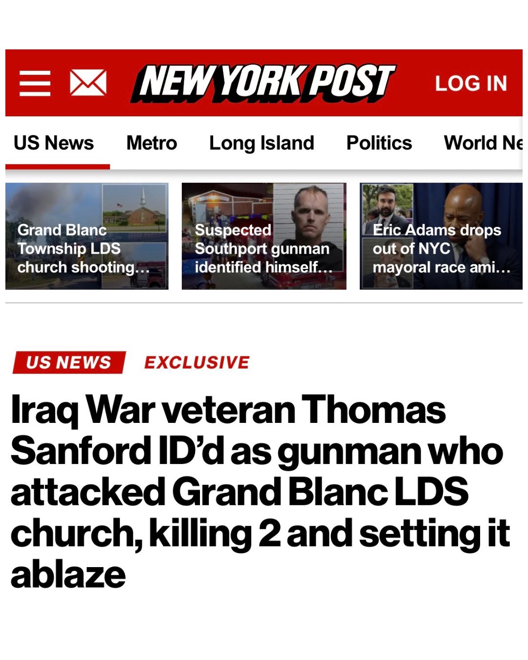 BREAKING: Authorities have identified the Grand Blanc, Michigan church shooter as 40-year-old veteran Thomas Jacob Sanford. pic.twitter.com/R0uIKBQtNo— Benny Johnson (@bennyjohnson) September 28, 2025