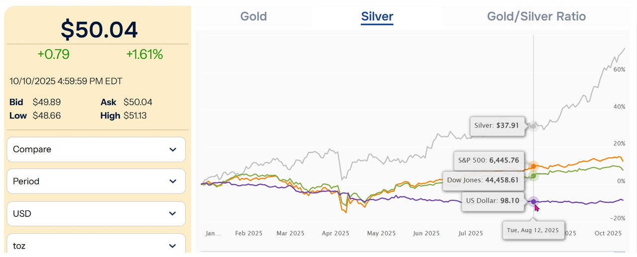 All the major currencies are fiat-based. So, consider another way of viewing "money", when there is something fundamentally wrong with fiat: Compare fiat (gold/silver derivatives, which is money substitutes) versus money itself (gold/silver).