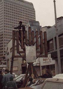 Today, most of the Jewish community has been won over to this view. But it wasn't so long ago that Chabad-Lubavitch encountered vehement opposition for spearheading the "shower them with light" approach. I remember one particular year in the mid 1980's when I was involved in helping organize the activities surrounding the public menorah lightings during Chanukah in Seattle (yes, the very same Seattle). A national Jewish organization took the city to court to try and force them to revoke their permission for Chabad-Lubavitch to put up the menorah. They were actually quite apologetic to us: "Please understand, we have nothing against your menorah, but we're suing the city to make them take down the Christmas trees and crèches, so in all fairness, we need to fight the menorah too..."