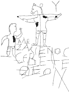 Of course, one last image of crucifixion could be mentioned. Below is some graffiti that depicts a man crucified with the head of a donkey. It includes the words, "Alexamenos worships [his] god." While nothing about it makes it explicitly anti-Christian, we do know that Christians were mocked with similar images according to Tertullian (Ad nationes 1:11, 14).