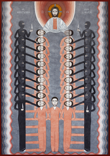 I recently stumbled across this interesting new piece of work by Mr Nikola Sarić, a Serbian artist currently living in Hannover, Germany. (Reproduced here with his kind permission.) It represents the martyrdom of the Coptic Martyrs of Libya, a group of Egyptian Copts who, as I am sure most of our readers will remember, were working in Libya when they were captured by Islamic fanatics, and had their throats cut on the seashore this past February.