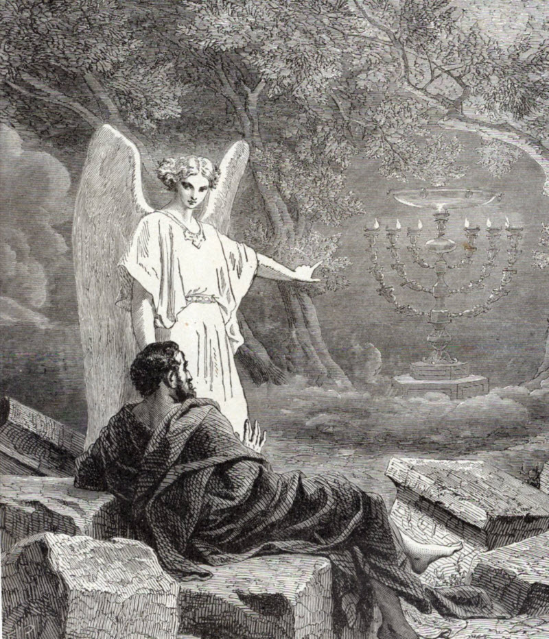 The Gold Lampstand and Two Olive Trees 1 Then the angel who talked with me returned and woke me up, like someone awakened from sleep. 2 He asked me, “What do you see?”