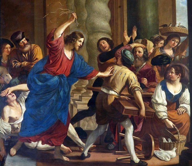 13 When it was almost time for the Jewish Passover, Jesus went up to Jerusalem. 14 In the temple courts he found people selling cattle, sheep and doves, and others sitting at tables exchanging money. 15 So he made a whip out of cords, and drove all from the temple courts, both sheep and cattle; he scattered the coins of the money changers and overturned their tables. 16 To those who sold doves he said, “Get these out of here! Stop turning my Father’s house into a market!” 17 His disciples remembered that it is written: “Zeal for your house will consume me.”
