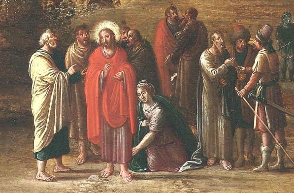 To be honest, I was reluctant to include it, despite its beauty, because it belies the text. Kim shows her tugging on Jesus’ garment in a way that He would have felt physically, whereas He reported feeling power go out from Him as His means of noticing it.
