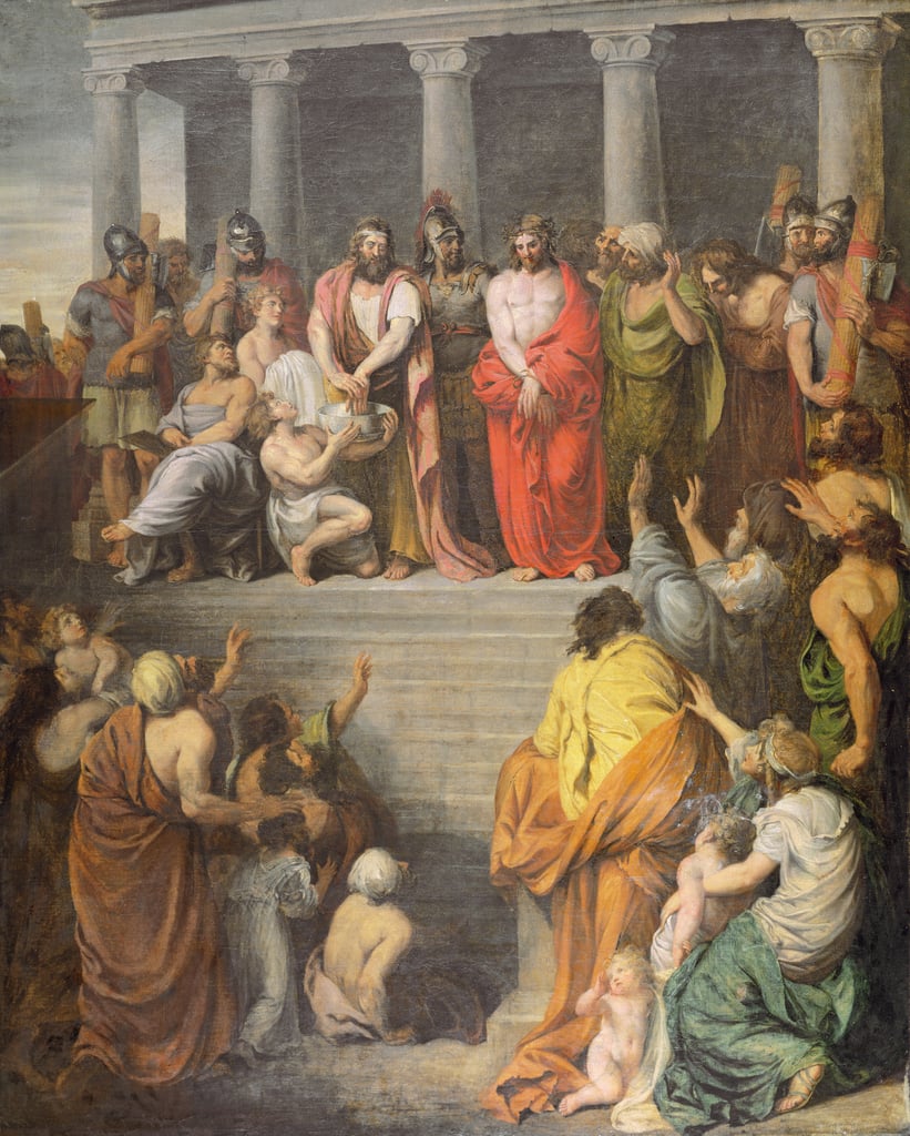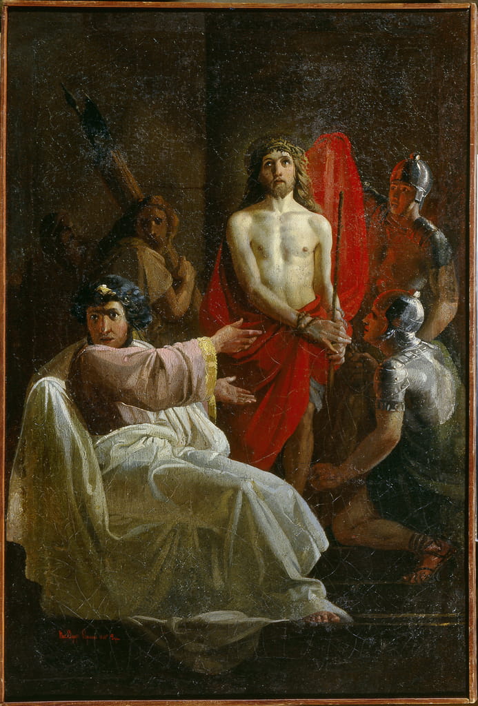28 French School "Jesus before Pilate" On hearing this, Pilate asked if the man was a Galilean. When he learned that Jesus was under Herod’s jurisdiction, he sent him to Herod, who was also in Jerusalem at that time.