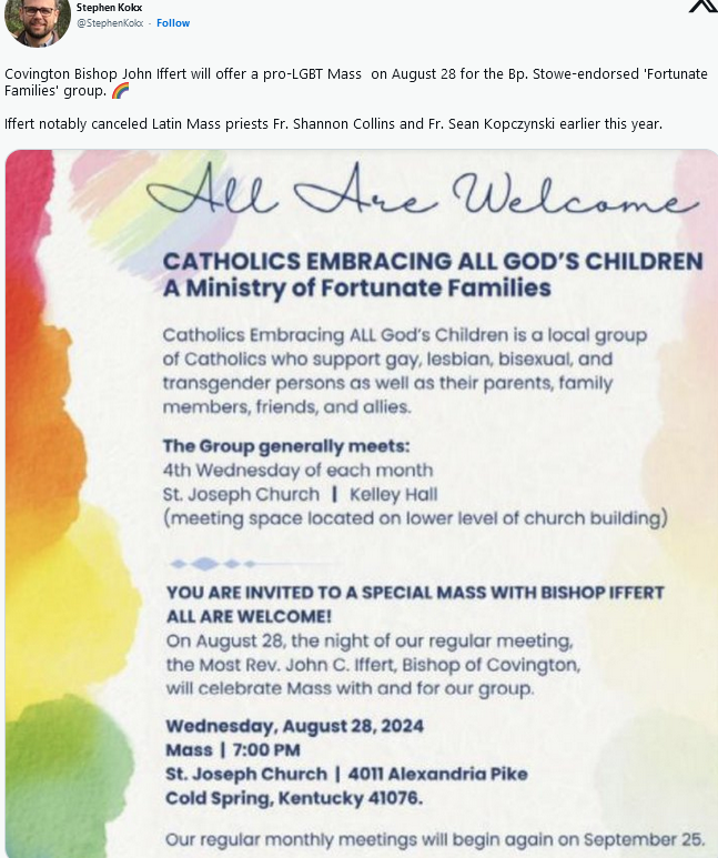 On August 28 at 7 p.m. at St. Joseph’s Church in Cold Spring, Kentucky, Bishop John Iffert will say Mass for a dissident Catholic “support group” named Catholics Embracing ALL God’s Children. The group participated in the Cincinnati Pride Parade in 2024.