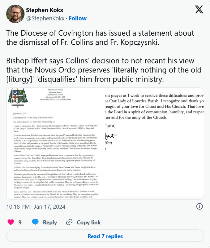 Iffert canceled Collins and Kopczynski in January 2024 after they refused to concelebrate a Novus Ordo Mass with him and after they said they would not recant a sermon wherein Collins remarked that the Novus Ordo liturgy preserves “literally nothing of the (Latin Mass).”