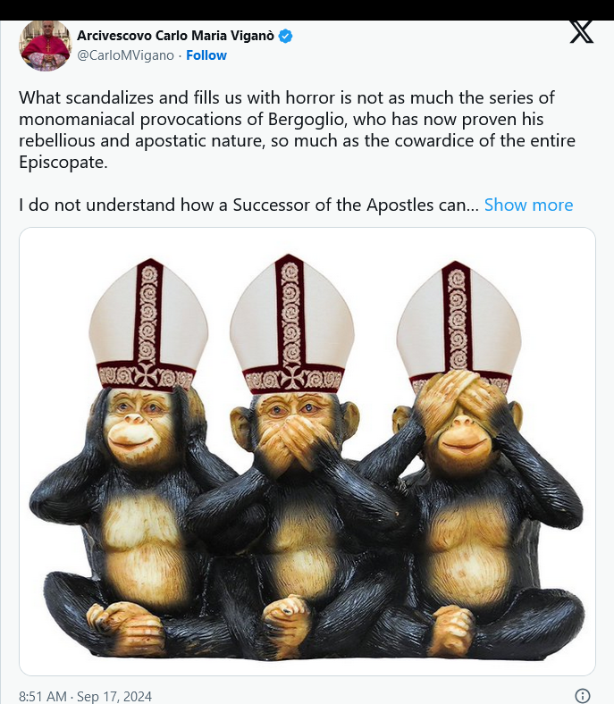 Editor’s note: The following statement has been taken from an X post made by Archbishop Carlo Maria Viganò originally published on September 17. The statement is a continuation of his September 13 statement in which he accused Francis of apostasy for telling a group of young people in Singapore that “all religions” are paths to God.