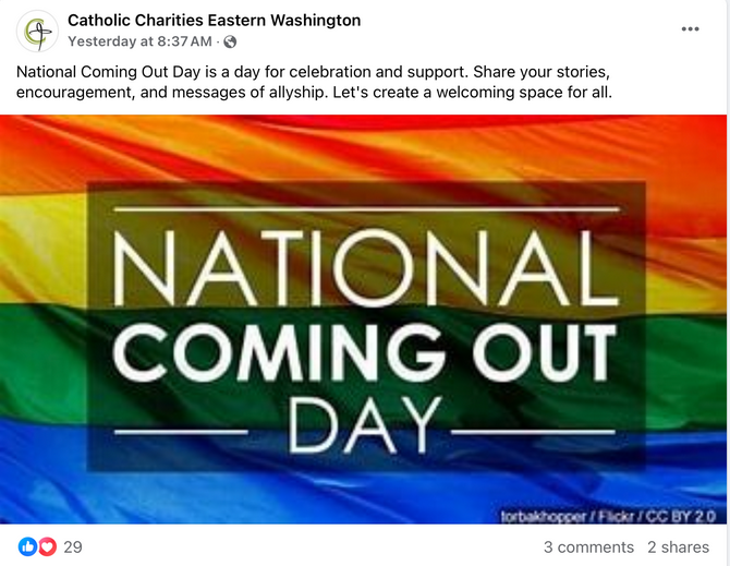 Catholic Charities of Eastern Washington has encouraged its social media followers to celebrate the pro-LGBT “National Coming Out Day” despite clear Church teaching on the immorality of homosexual behavior.