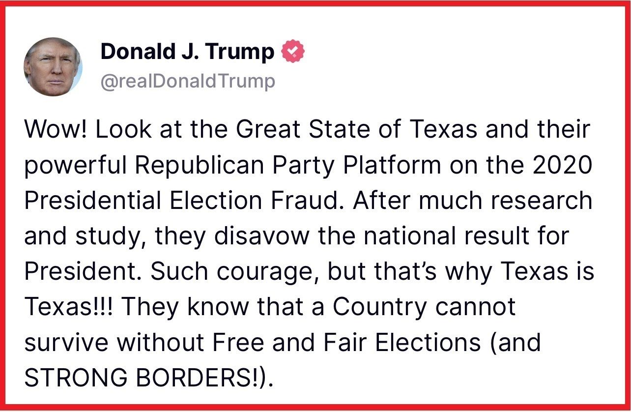 Wow! Look at the Great State of Texas and their powerful Republican Party Platform on the 2020 Presidential Election Fraud. After much research and study, they disavow the national result for President. Such courage, but that is why Texas is Texas!!! They know that a Country cannot survive without Free and Fair Elections. (And STRONG BORDERS!)