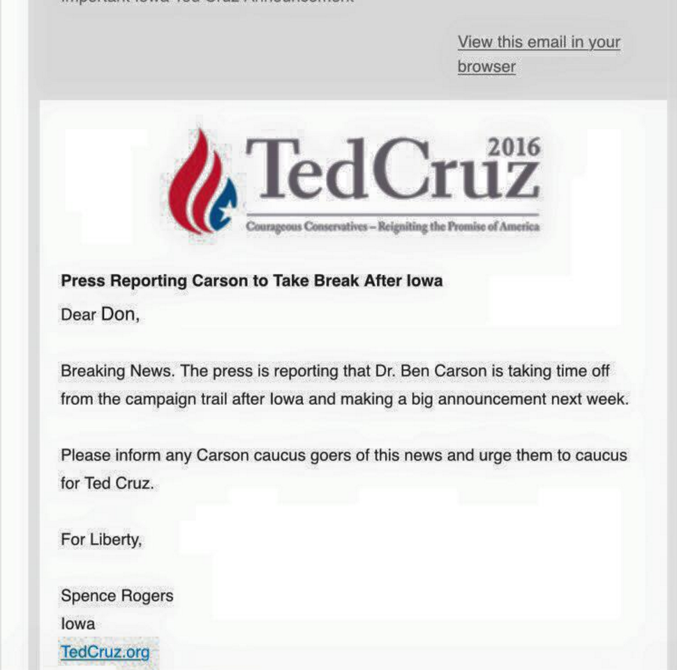 Some people are claiming that the following screenshot is of an email from someone at the Cruz campaign. To my eye, it looks like a poorly Photoshopped hoax. Note the size/color of the font in the name "Don," the white blocks that appear to be where someone cleared area on the image, and the oddly cropped JPG artifacts around the letters. What say you? Is this a real screenshot of a real email from someone at the Cruz campaign? Or is it a fake?